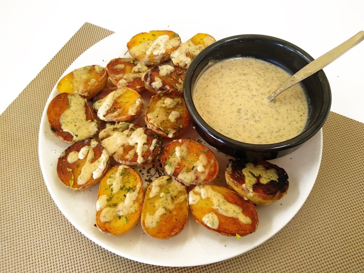 Patatas salteadas con aliño de pasta tahini, eneldo y limón