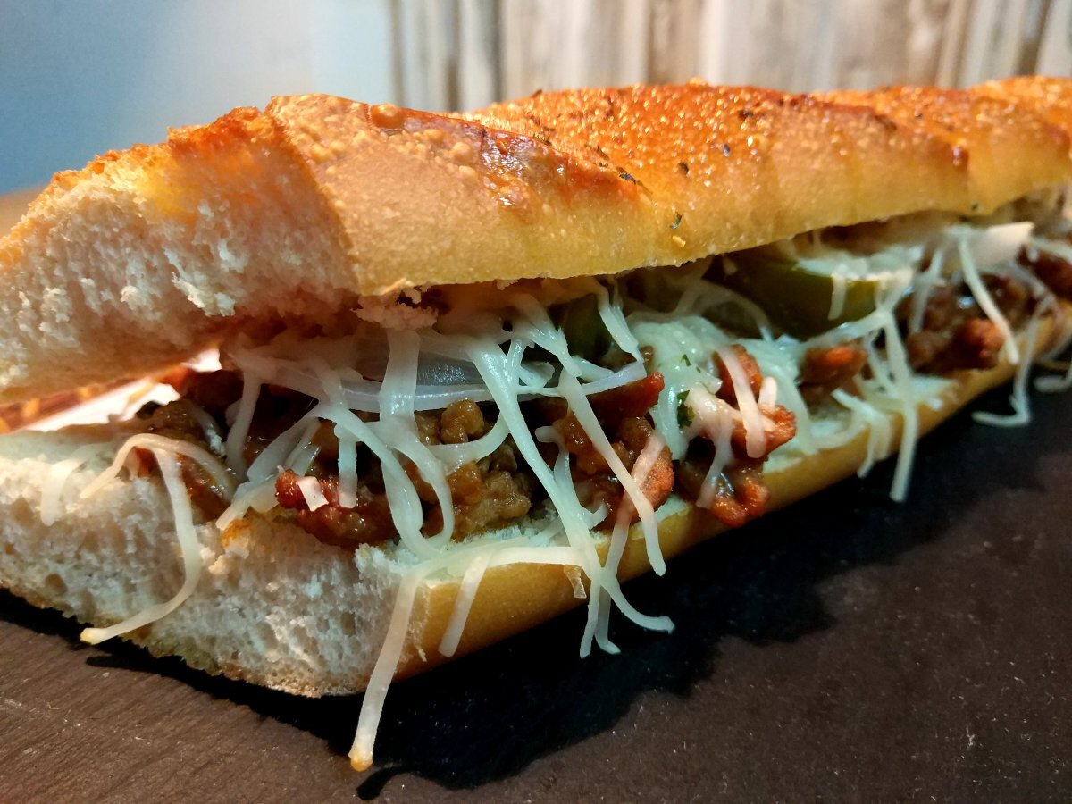 Bocadillo de carne picada a la barbacoa con jalapeños y queso.