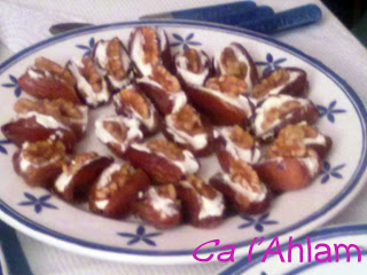 Canapés de dátil y nueces AperitivoMedio15 min411 Kcal Enviar esta receta a un amigo Imprimir esta página Preguntar al autor Publicar la foto de esta receta Ingredientes 4 200 g de dátiles 1 bote de queso para untar (tipo philadelphia) 100 g de nueces Costo estimado: 4.2Euros€ (1.05€/porción)