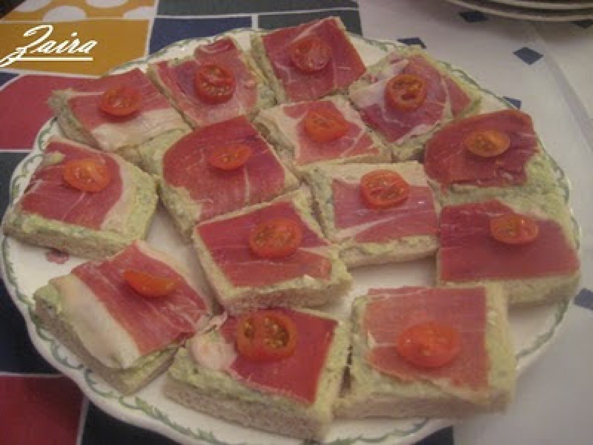 Canapés de jamón con crema de queso gorgonzola AperitivoFácil35 min361 Kcal Enviar esta receta a un amigo Imprimir esta página Preguntar al autor Publicar la foto de esta receta Ingredientes 6 6 rebanadas de pan de molde sin corteza cortadas en cuatro 125 gr. de queso Gorgonzola 12 lonchas finas de jamón serrano 100 gr. de mantequilla tomates cherry para el adorno Costo estimado: 9.22Euros€ (1.54€/porción)