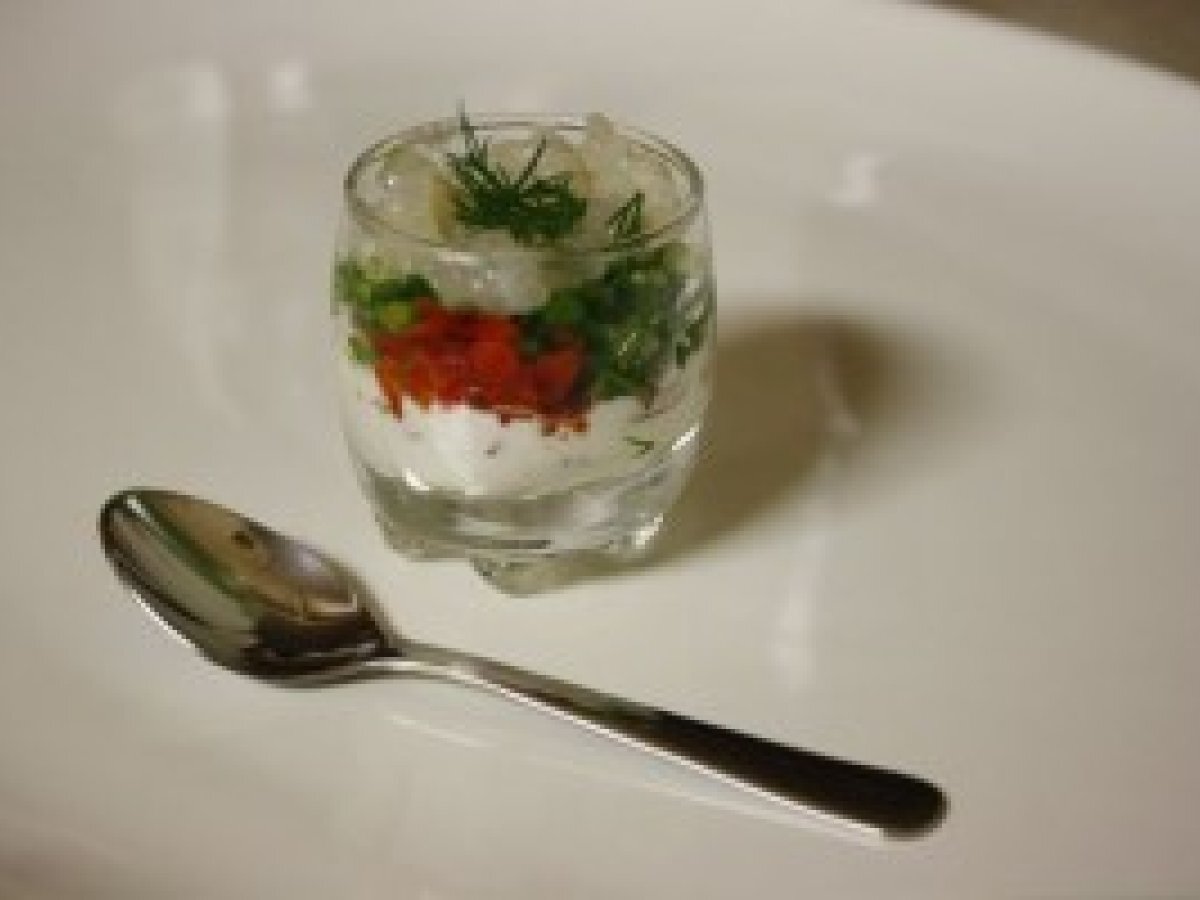Ceviche de vieiras con crema fraiche, pimiento morrón y eneldo