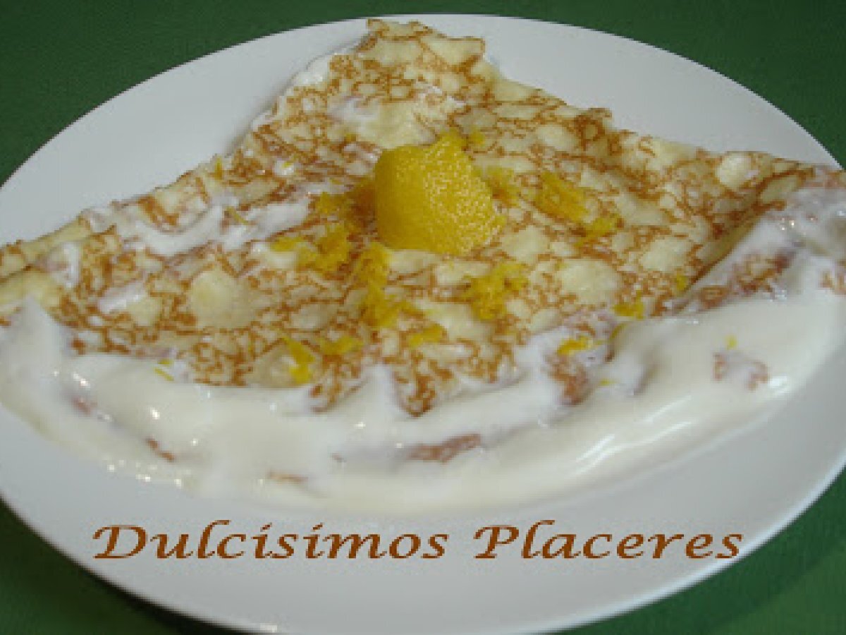 Crêpes con crema de yogur con queso y limón AperitivoFácil20 min Enviar esta receta a un amigo Imprimir esta página Preguntar al autor Publicar la foto de esta receta Ingredientes 2 Masa para crêpes: (30 unidades) 250 g de harina 500 g de leche 2 huevos 1 cucharada de aceite de oliva virgen extra 1 pellizco de azúcar 1 pellizco de sal Crema de yogur: Yogur griego (1 por persona) Queso crema (1 cucharada de postre por persona) Azúcar (a nuestro gusto) El zumo de 1 limón por cada dos yogures