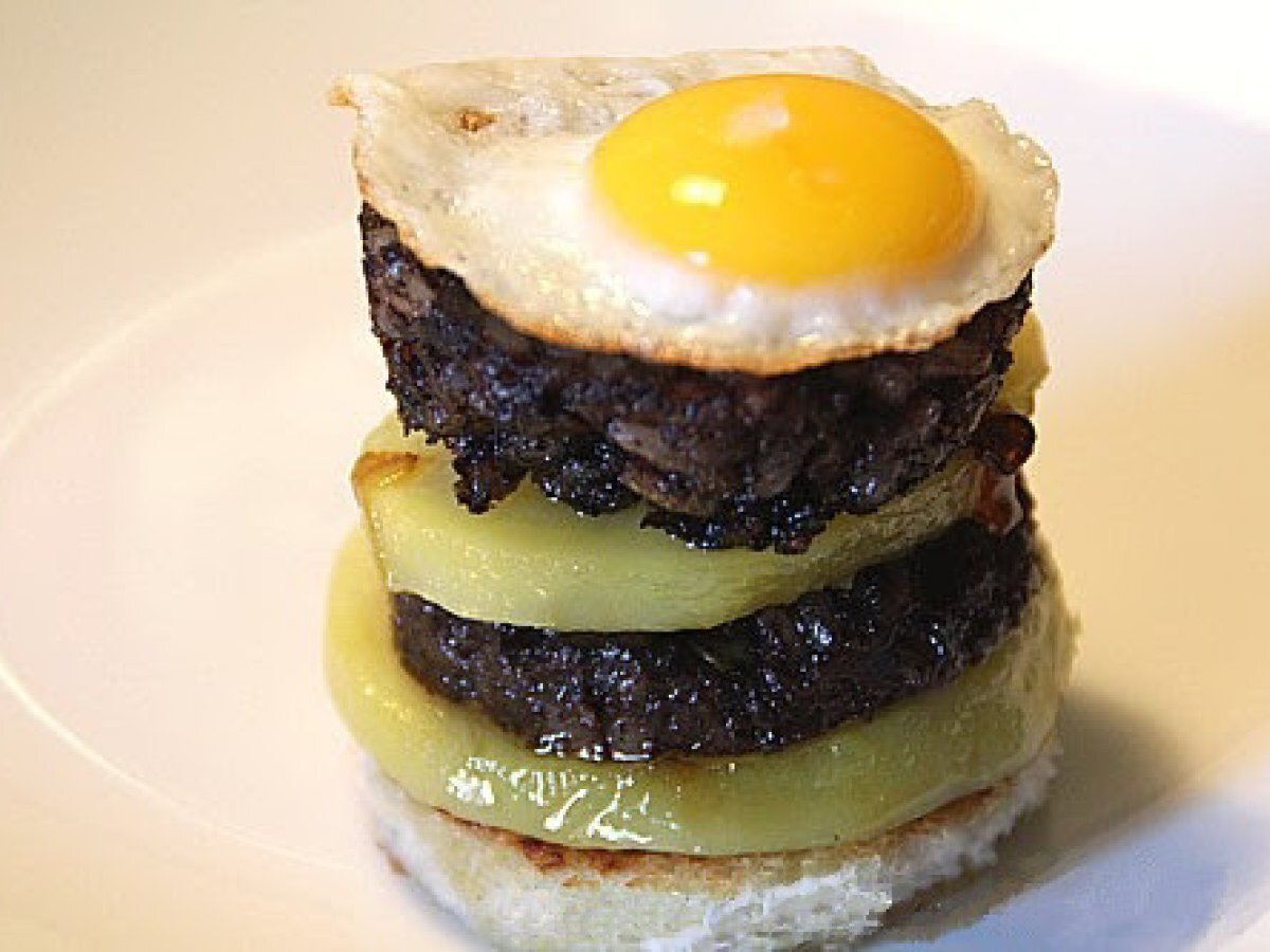 Pincho de morcilla de burgos con queso de cabra y patata cocida AperitivoFácil18 min948 Kcal Enviar esta receta a un amigo Imprimir esta página Preguntar al autor Publicar la foto de esta receta Ingredientes 1 1 morcilla de Burgos 1 patata grande 4 rodajas de queso rulo de cabra 4 huevos de codorniz aceite de oliva sal.