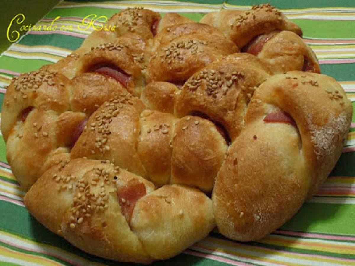 - Cuando pita de que ha finalizado sacamos la masa y espolvoreamos harina en la mesa de trabajo y amasamos la masa un poco para sacar el aire que tiene, con un rodillo estiramos la masa y le daremos forma de pizza en círculo ,la masa tiene que tener 1 cm de grosor y nos disponemos a cortarla, haremos triángulos han salido 9, en cada triangulo untamos con tomate no mucho