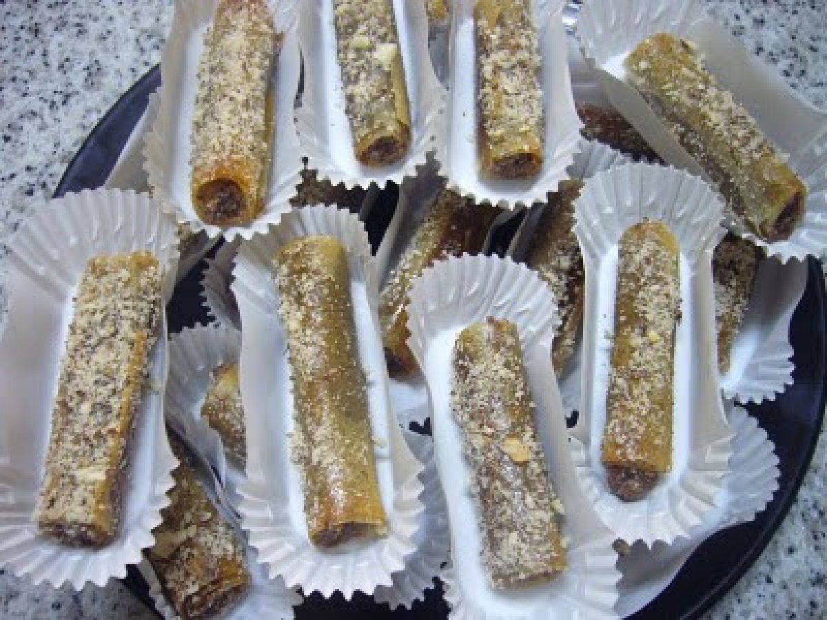 Rollitos de almendra AperitivoFácil35 min677 Kcal Enviar esta receta a un amigo Imprimir esta página Preguntar al autor Publicar la foto de esta receta Ingredientes 6 Para el relleno: 300 g de almendras 100 g de azúcar 50 g de agua de azahar 100 g de mantequilla 1 cta. de canela Para el sirope: 400 g de agua 200 g de azúcar 1 cucharada de agua de azahar 3 cucharadas de miel Costo estimado: 7.78Euros€ (1.3€/porción)