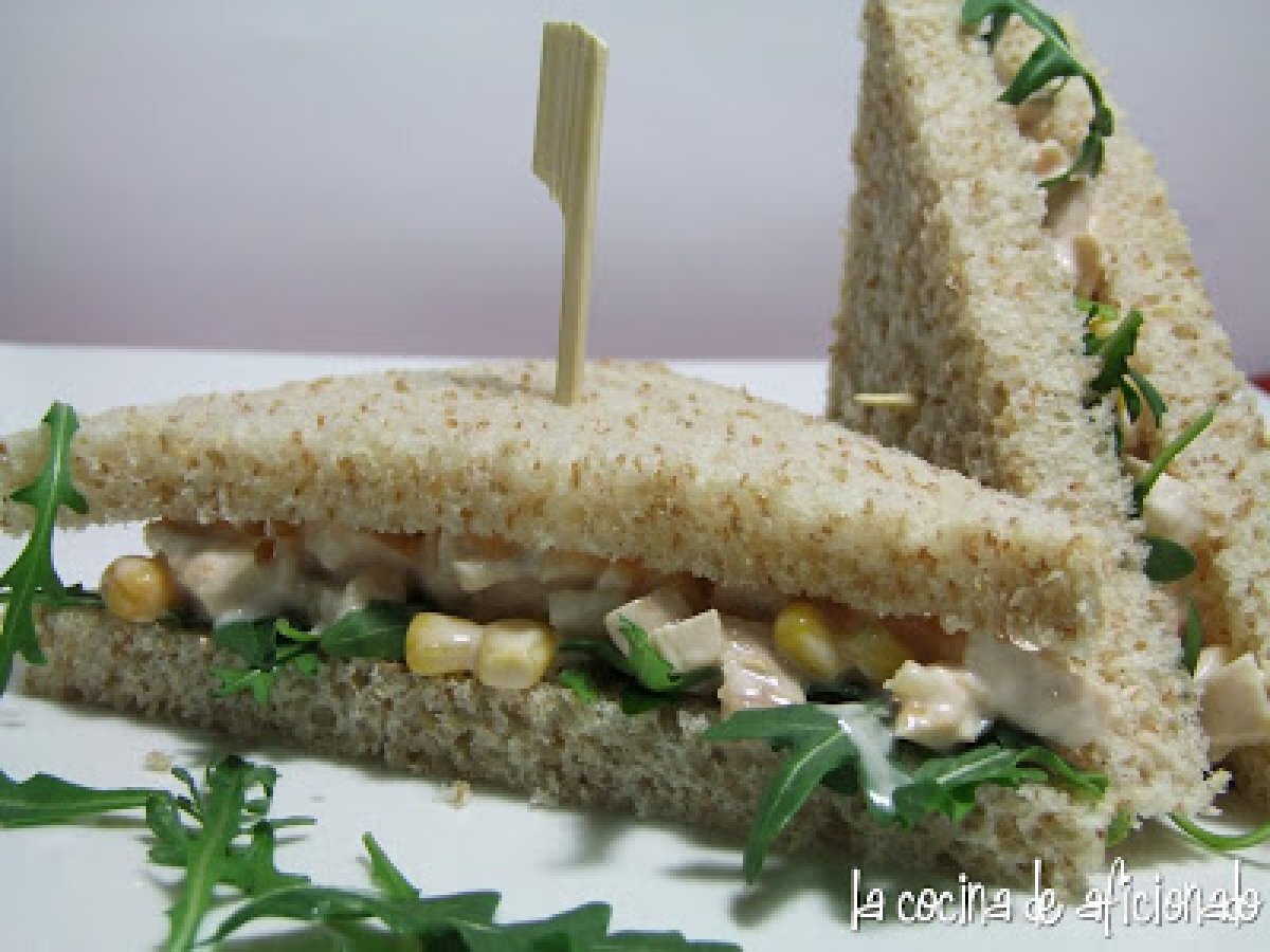 Sándwich de pollo y piña AperitivoFácil20 min804 Kcal Enviar esta receta a un amigo Imprimir esta página Preguntar al autor Publicar la foto de esta receta Ingredientes 2 2 rebanadas de pan integral sin corteza 1 filete de pollo 1 rodaja de piña natural o en su jugo 30 g de maíz (1 cucharada sopera) 1 cucharada sopera de mayonesa 1 cucharadita de kétchup 1 cucharadita de brandy 2 cucharaditas de zumo de naranja Rúcula