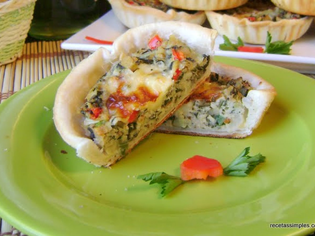 Tartas de pescado y verduras AperitivoFácil50 min Enviar esta receta a un amigo Imprimir esta página Preguntar al autor Publicar la foto de esta receta Ingredientes 12 12 discos de empanadas 2 tazas de pescado cocinado 2 tazas de acelga hervida 1 cebolla de verdeo 1 pimiento rojo 3 huevos 200 g de queso cremoso 1 cdta de orégano sal y pimienta