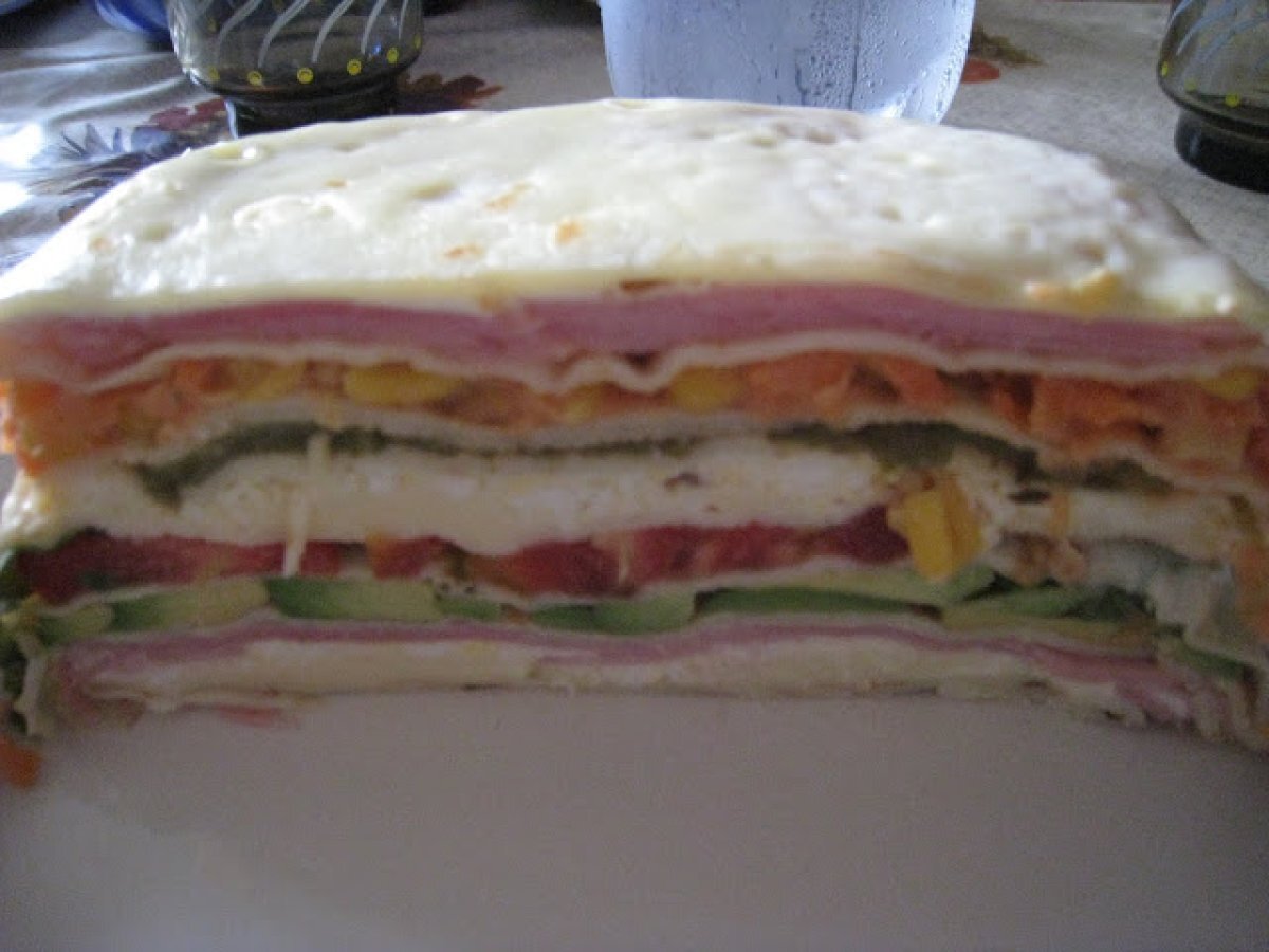 Torre fria de panqueques AperitivoFácil35 min Enviar esta receta a un amigo Imprimir esta página Preguntar al autor Publicar la foto de esta receta Ingredientes 4 panqueques C/N queso fresco jamon palta queso blanco huevo ajies asados zanahoria mayonesa y ketchup tomates