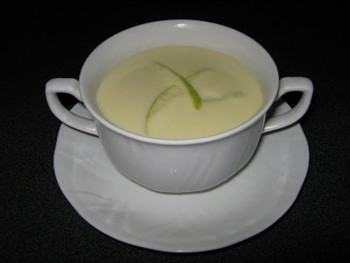 Vichyssoise de manzana y puerro AperitivoFácil55 min541 Kcal Enviar esta receta a un amigo Imprimir esta página Preguntar al autor Publicar la foto de esta receta Ingredientes 3 4 puerros grandes (sólo la parte blanca) 3 manzanas verdes (golden) 60 g de aceite de oliva 500 g de agua sal 1 bote de leche evaporada 200 g de nata para cocinar Costo estimado: 3.89Euros€ (1.3€/porción)