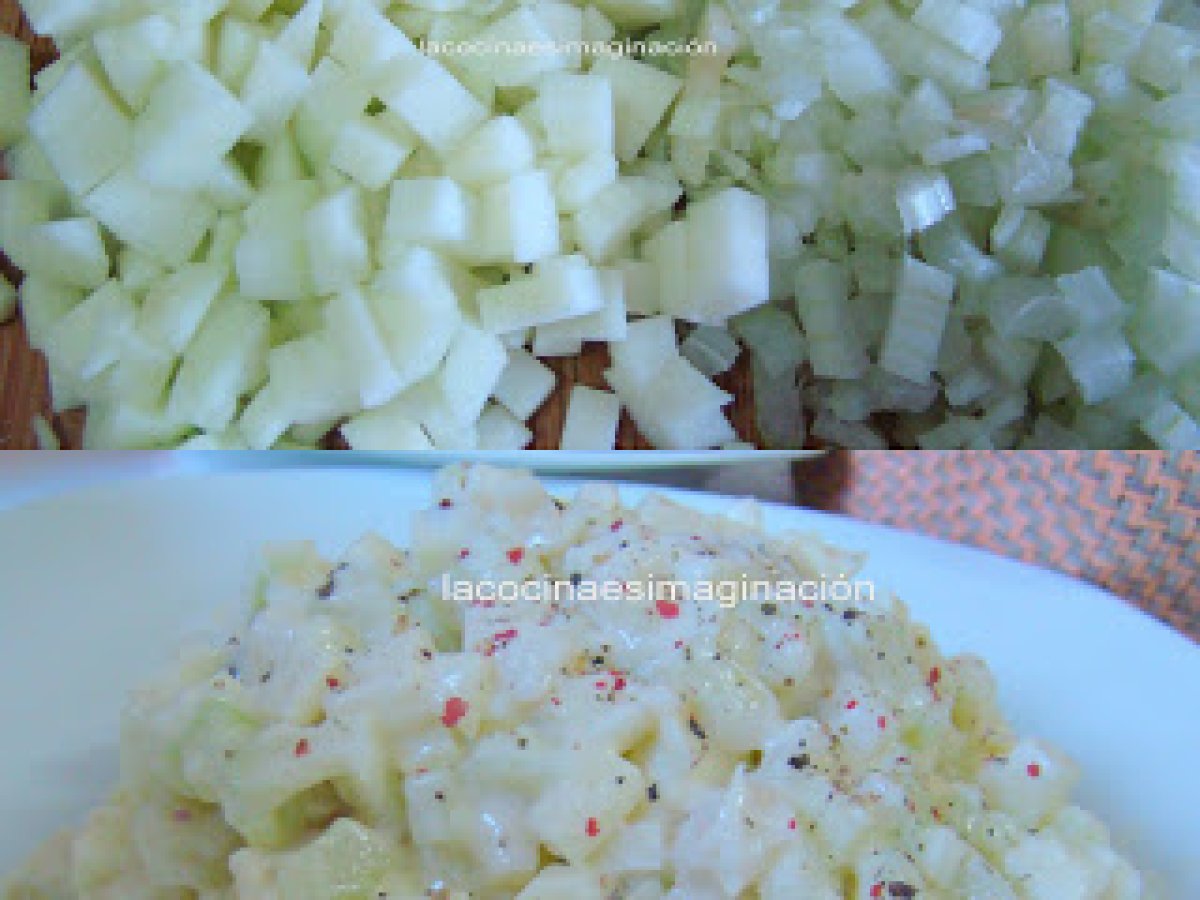 Bacalao ahumado, apio, manzana... delicioso¡¡ EntranteMedio40 min Enviar esta receta a un amigo Imprimir esta página Preguntar al autor Publicar la foto de esta receta Ingredientes 2 Apio blanco manzana ácida bacalao ahumado Unas cucharadas de mahonesa mezcla de pimientas
