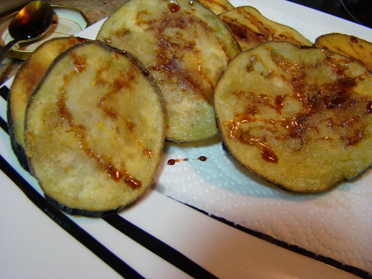 Berenjenas con miel de caña EntranteMedio40 min Enviar esta receta a un amigo Imprimir esta página Preguntar al autor Publicar la foto de esta receta Ingredientes 2 1 berenjena. Aceite de oliva. Sal. Agua. Harina de rebozar. Miel de caña. Costo estimado: 0.62Euros€ (0.31€/porción)