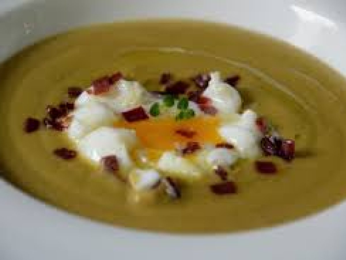 Crema de borrajas con virutas de jamon de teruel y huevos de codorniz