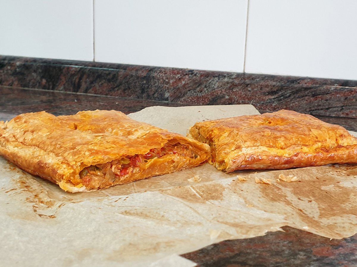 Ahora precalentamos el horno a 190º con calor arriba y abajo. Y mientras se calienta el horno, vamos a ir estirando una lámina de hojaldre para dejarla lo más fina posible. Una vez estirada la masa, la dividimos en 2 partes lo más parecidas posible. Y sobre una de esas mitades vamos añadiendo el relleno sin llegar a los bordes. Después sobre los bordes, con la ayuda de una brocha de silicona los vamos untando con el huevo que habíamos batido anteriormente.