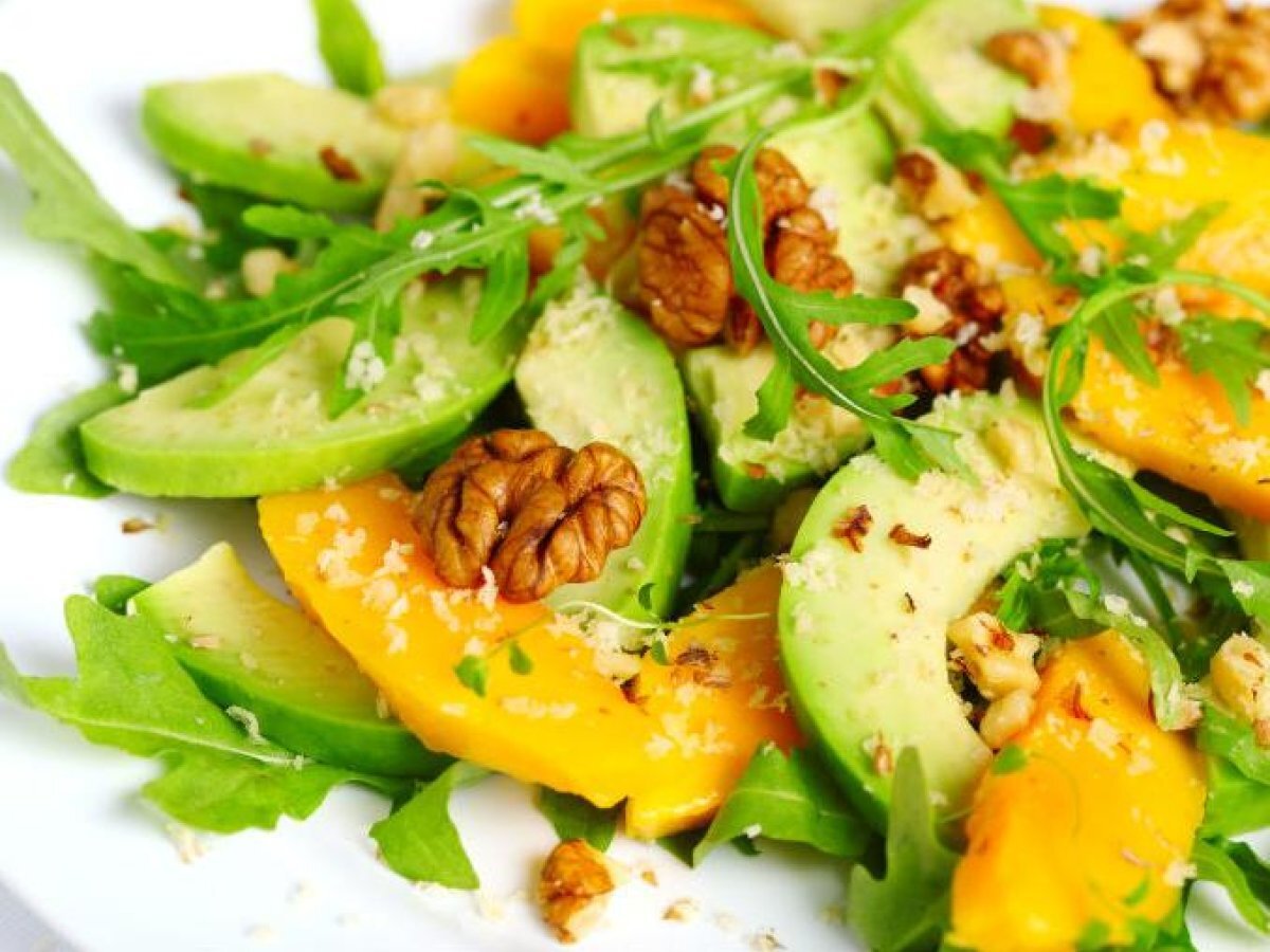 Ensalada de aguacate y mango con vinagreta de frutos secos. Ensalada facil de preparar y muy rica de comer ademas la presentacion queda genial y suele gustar mucho