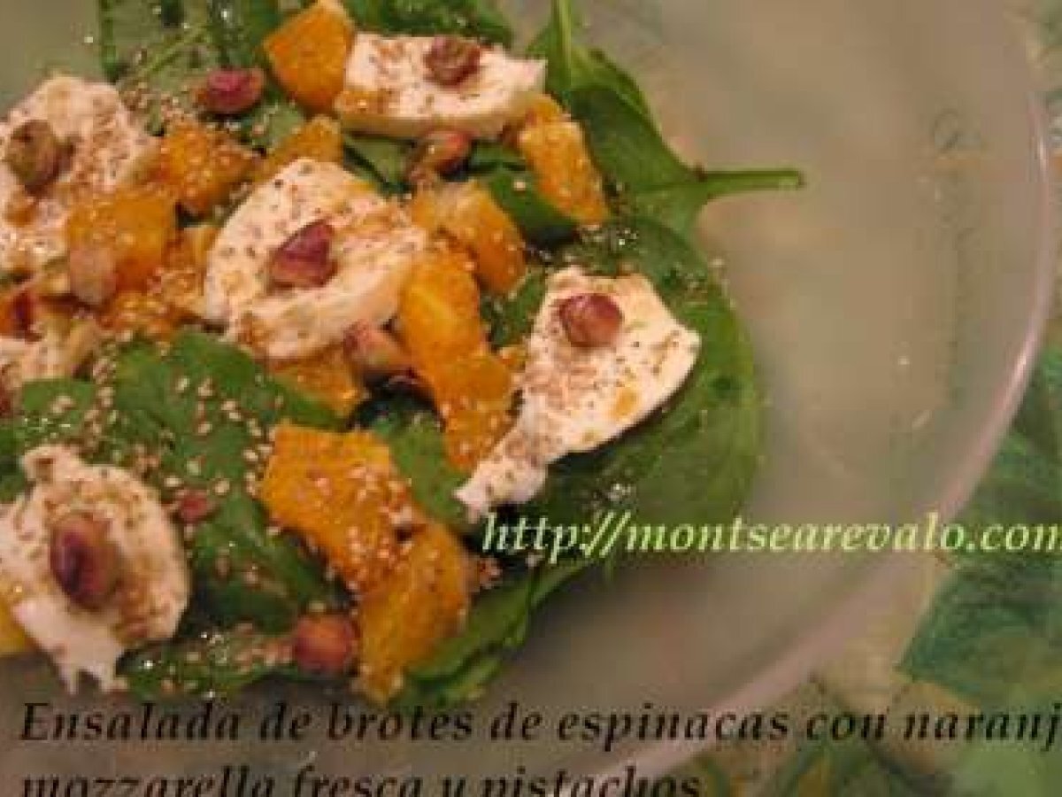 Ensalada de brotes de espinacas con naranja, mozzarella fresca y EntranteFácil10 min Enviar esta receta a un amigo Imprimir esta página Preguntar al autor Publicar la foto de esta receta Ingredientes 4 brotes de espinaca una naranja cortada a rodajas y luego a cuartos mozzarella fresca cortada a láminas semillas de sésamo unos pistachos vinagre balsámico de módena, aceite y sal