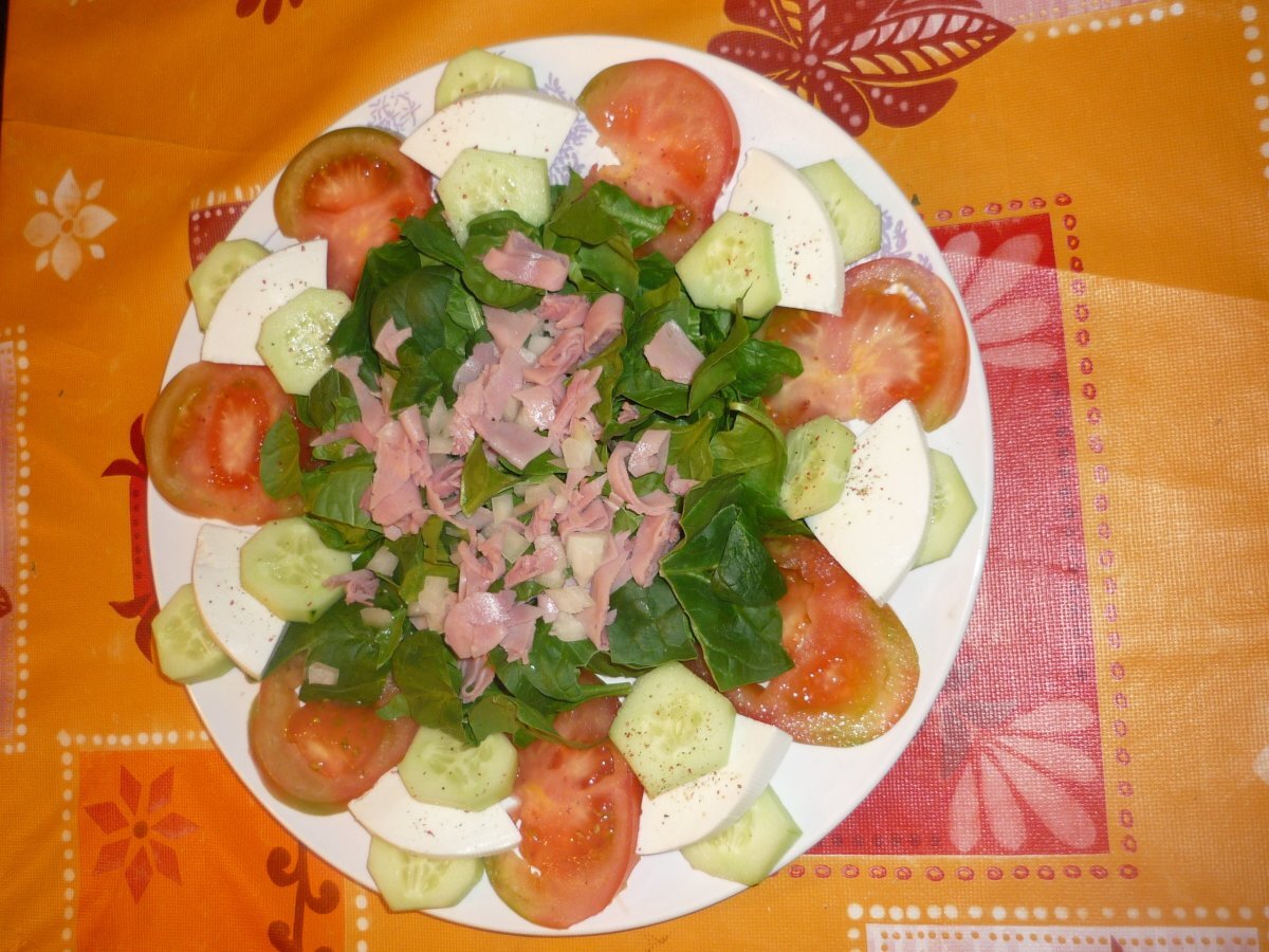 Ensalada de espinacas, queso fresco y pepino. EntranteFácil10 min Enviar esta receta a un amigo Imprimir esta página Preguntar al autor Publicar la foto de esta receta Ingredientes 5 Un puñado de espinacas frescas (Mercadona) 1 Tomate. 1/2 Cuña de queso fresco. 1/4 Cebolla. 2 Lonchas de Jamón York. 2 Pepinos. Mezla 3 pimientas (opcional) Aliño al gusto (Aceite... sal..)