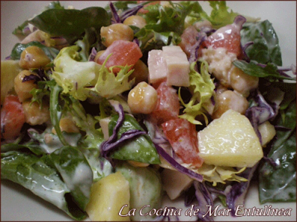 Ensalada de garbanzos con salsa de queso EntranteFácil25 min Enviar esta receta a un amigo Imprimir esta página Preguntar al autor Publicar la foto de esta receta Ingredientes 2 1 bolsa de mezcla de ensalada de vegetales (Escarola rizada, col lombarda, rúcula, espinacas y lechuga lollo rosso) 1 tomate grande 1 manzana 50 g de pavo 1 bote pequeño de garbanzos (210 g.) Para la salsa de queso: 90 g de queso crema Linessa Si se utiliza otra marca, puntuar según valores nutricionales. 2 Cds de leche desnatada 1 Cd de zumo de limón 1 ct de mostaza pimienta molida perejil troceado sal