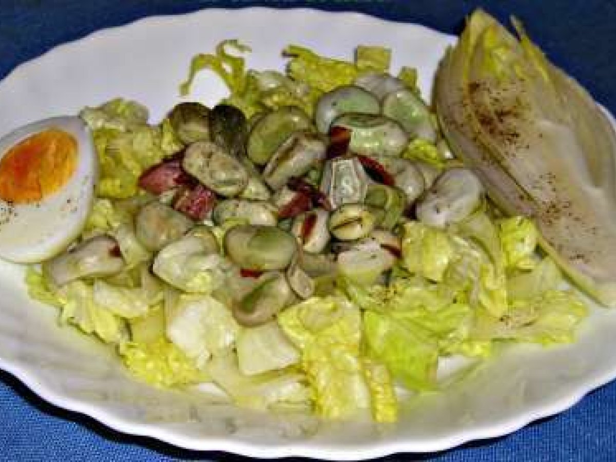 Ensalada de habitas con vinagreta de miel EntranteFácil20 min285 Kcal Enviar esta receta a un amigo Imprimir esta página Preguntar al autor Publicar la foto de esta receta Ingredientes 2 Unas hojas de lechuga a trocitos Habitas baby congeladas Tacos de jamón serrano 1 Huevo duro 1 Endivia Pimienta negra Para la vinagreta de miel: 1 Cucharada de aceite de oliva por persona 1 Cucharada de vinagre de módena por persona 1 Cucharada de miel- tibia por cada dos personas Costo estimado: 4.11Euros€ (2.05€/porción)