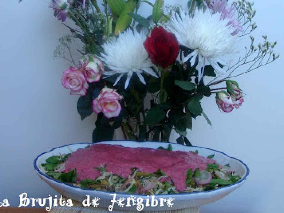 Ensalada de jamón serrano con aderezo de frambuesas...un embrujo agridulce!!! EntranteFácil1 h 5 m Enviar esta receta a un amigo Imprimir esta página Preguntar al autor Publicar la foto de esta receta Ingredientes 1 150 g De jamón serrano 250 g De espárragos 120 g De queso parmesano rallado estilo juliana 1/ 2 mata de albahaca 100 g De aceitunas verdes descarozadas y cortadas en "rodajas" 2 tazas de rúcula 100 g De rábanos naturales 1 taza de frambuesas, pueden ser congeladas 1 /2 taza de vinagre de manzana 1 cucharada de jerez 1 bolsa de crema ácida light 4 cucharadas de aceite de oliva 1 cucharada de azúcar un poco de albahaca picada muy fina