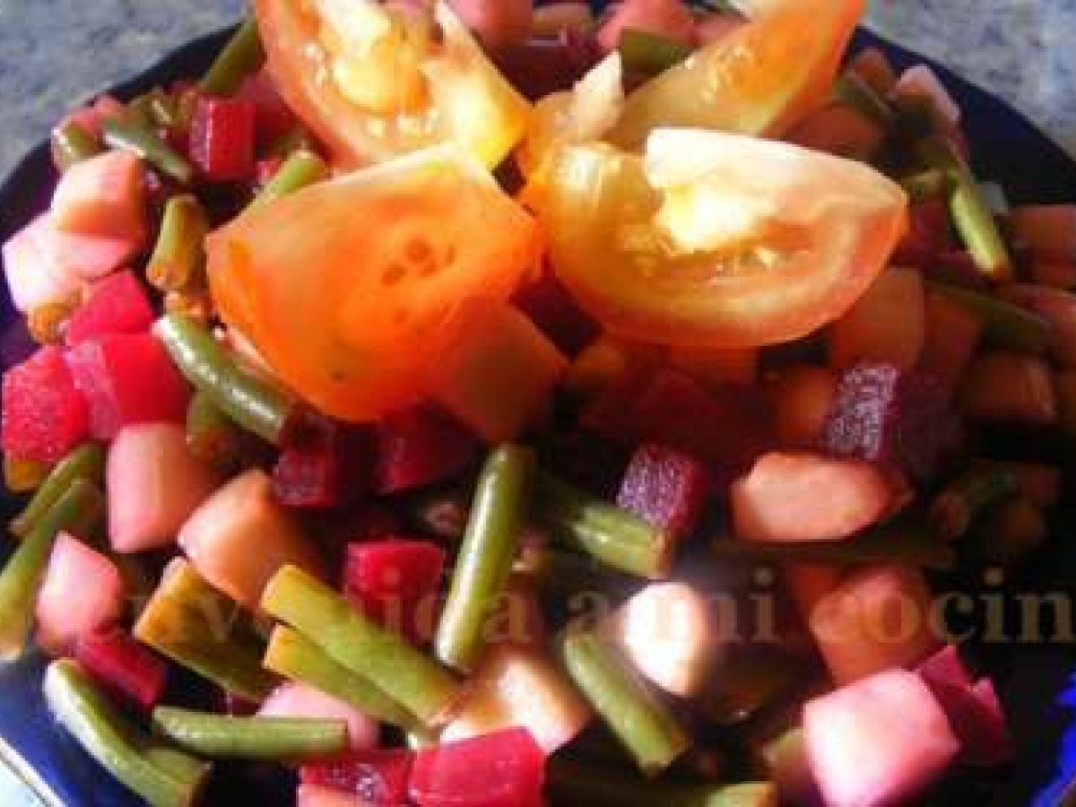 Ensalada de judías verdes EntranteFácil25 min Enviar esta receta a un amigo Imprimir esta página Preguntar al autor Publicar la foto de esta receta Ingredientes 6 Ingredientes (justo lo que yo puse, que me dio para 2 platos como el que veis): 2 Pepinos grandes 4 ó 5 remolachas pequeñas (podéis usar de bote, las mías eran frescas por lo que tuve que cocerlas, pelarlas...) 2 puñados de judías verdes Sal Aceite de oliva El zumo de un limón Una pizca de azúcar Para decorar: Medio tomate cortado en cuartos