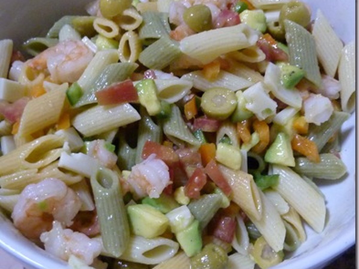 Ensalada de pasta tricolor EntranteMedio45 min Enviar esta receta a un amigo Imprimir esta página Preguntar al autor Publicar la foto de esta receta Ingredientes 4 1/2 Libra de pasta tricolor 10 camarones cocidos 1 lata de aceitunas rellenas de anchoa 1 aguacate 1 tomate mediano 1 pimento morrón color de tu preferencia 1 Cucharada de sal y agua suficiente para la pasta Para Vinagreta 1 limón 1/4 taza vinagre balsámico 1/3 taza de aceite de oliva 1 cucharadita de sal 1 cucharadita pimienta 1 cucharadita de mostaza en polvo