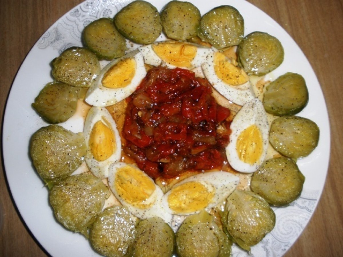 Ensalada fresca con pimientos asado, huevo y coles de bruselas cocidas, aliñada con aceite, pimienta y sal