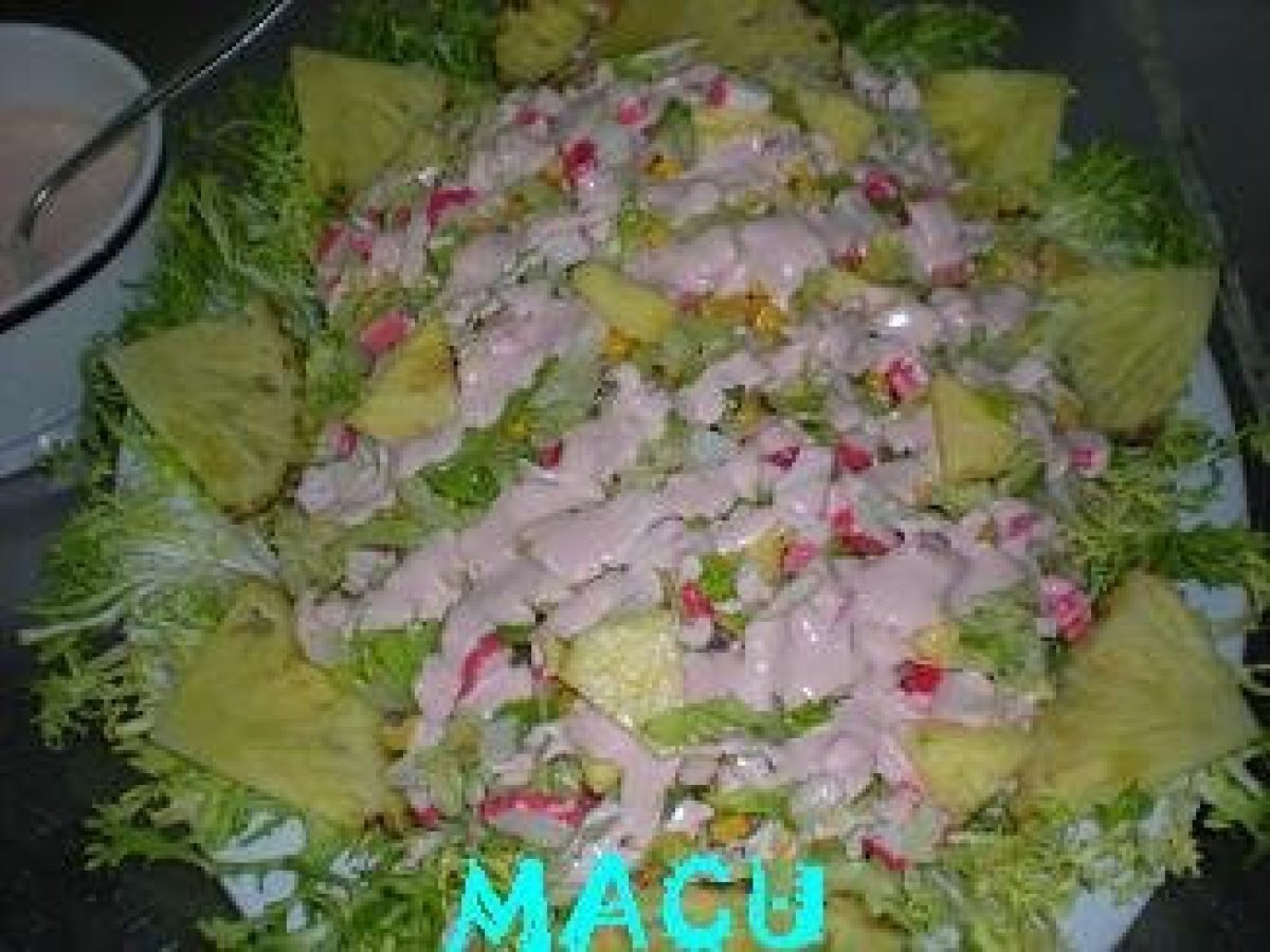 Ensalada de piña y cangrejo EntranteFácil20 min386 Kcal Enviar esta receta a un amigo Imprimir esta página Preguntar al autor Publicar la foto de esta receta Un entrada magnifica Ingredientes 2 lechuga palitos de cangrejo piña natural maíz dulce
