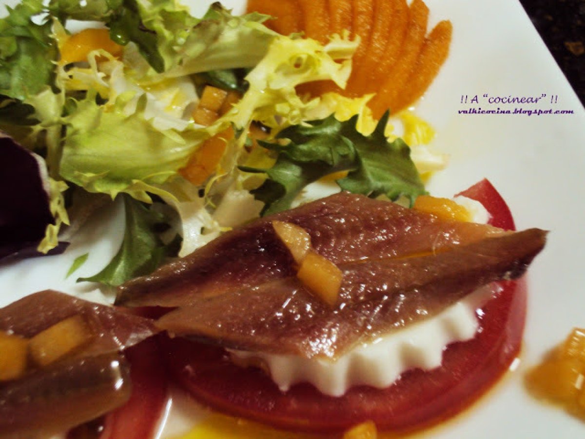 Ensalada de queso burgos y anchoas con vinagreta de fruta