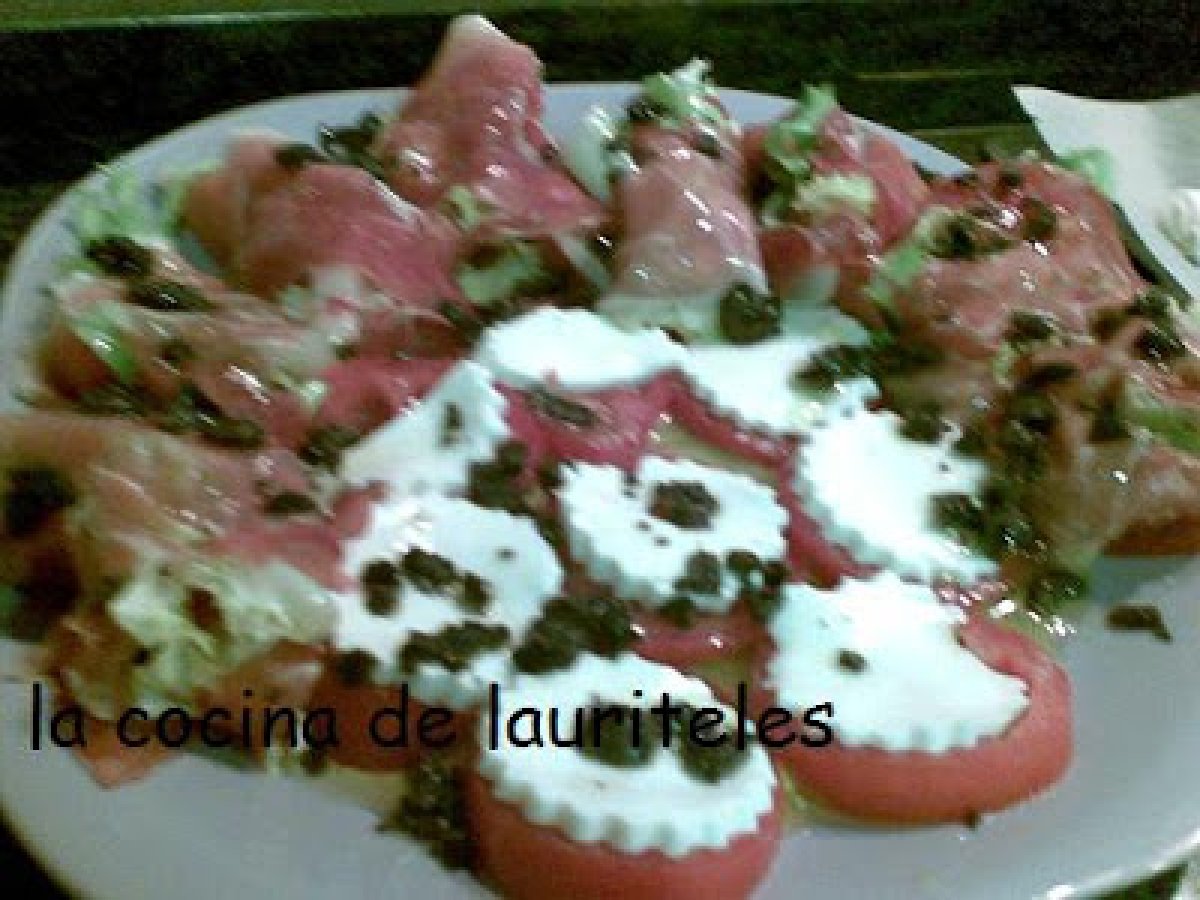 Ensalada de rollitos de jamón serrano con aliño de aceitunas negras
