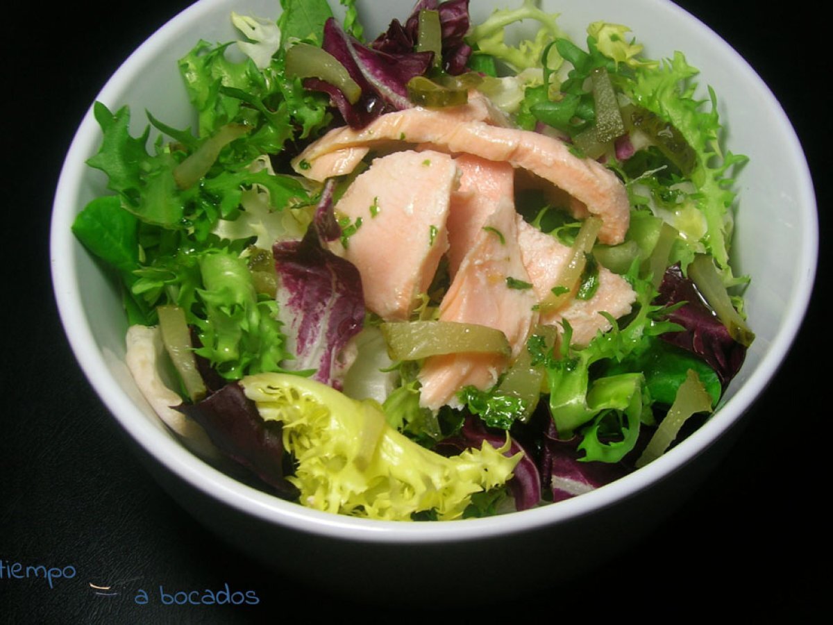 Hoy os propongo algo muy sencillo, pero con muchas posibilidades, ¡ahí está lo bueno ! Vamos a preparar una simple ensalada, acompañada de un delicioso salmón, una combinación fresca para esta temporada. Aunque por mi parte, yo la preferiría servir algo tibia, añade un toque distinto a un plato tan normal como una ensalada. Pero la cosa no acaba ahí. Incorporamos unos riquísimos pepinillos agridulces que rematarán el plato por completo.
