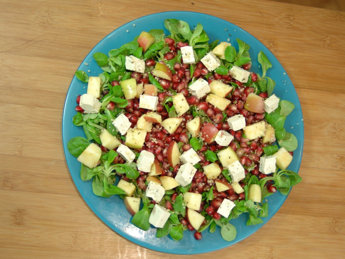 Hola amigos!! Hoy os traigo una ensalada dulce con granada. Esta ensalada me encanta, es una forma rica y variada de tomar vegetales y frutas. Además añadimos nuestro toque de proteínas con tofu y semillas de cáñamo.