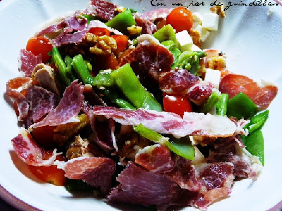 Ensalada templada de judias verdes EntranteFácil25 min442 Kcal Enviar esta receta a un amigo Imprimir esta página Preguntar al autor Publicar la foto de esta receta Ingredientes 1 Judías verdes. Nueces. Huevo duro. Queso en trozos (feta o un queso blanco más suave). Jamón serrano en lonchas. Tomate crudo para ensaladas. Costo estimado: 2.1Euros€ (2.1€/porción)