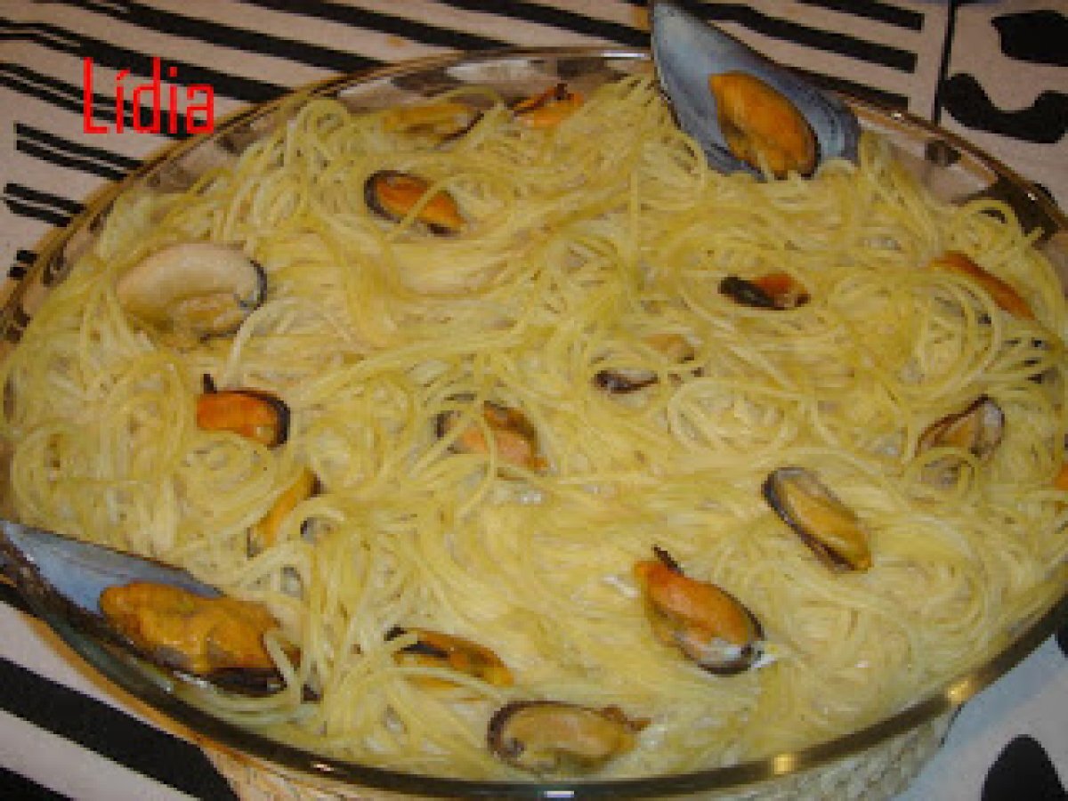 Espaguetis a la crema de mejillones