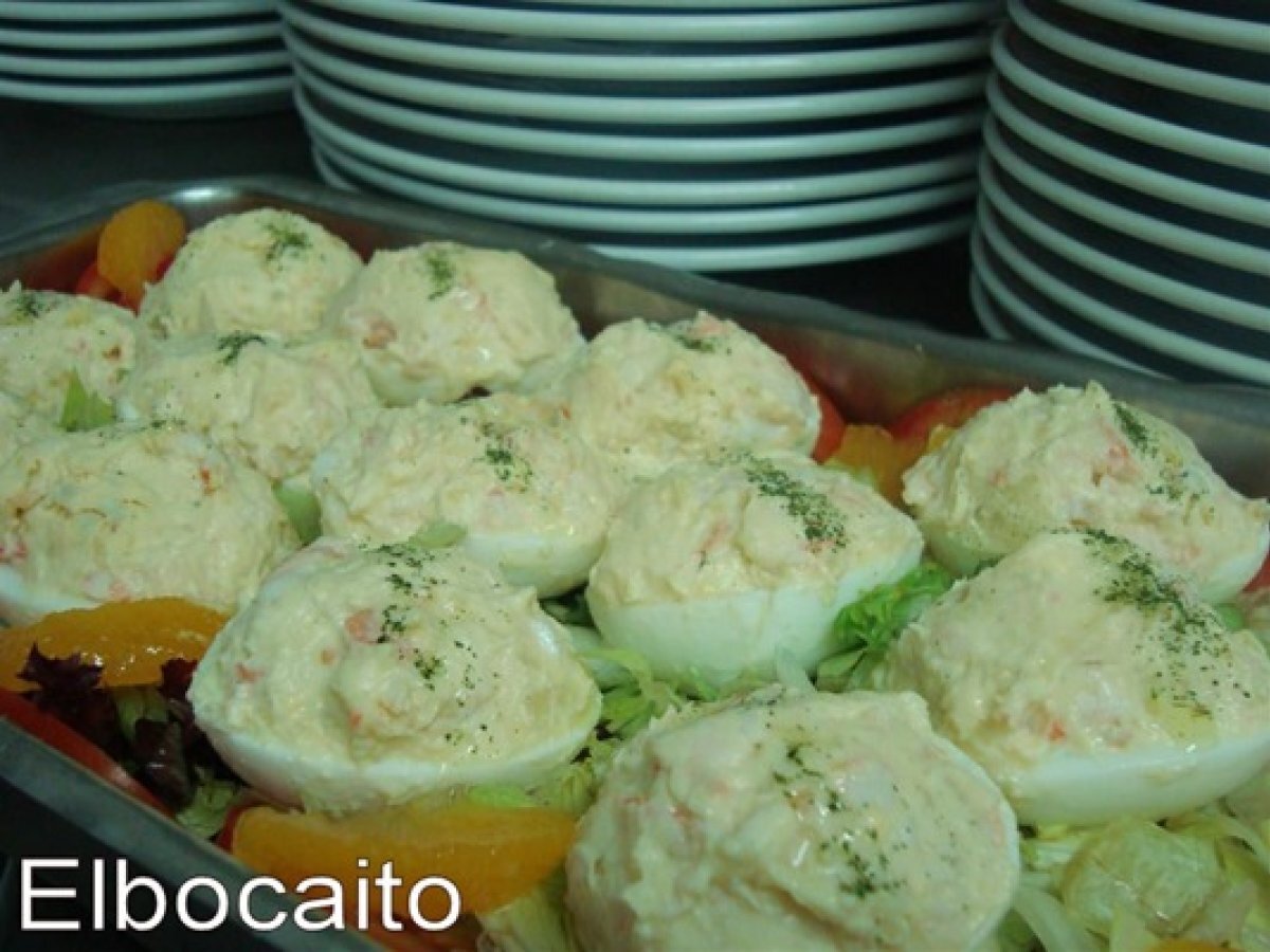 Huevos rellenos de mousse de langostinos al ajillo. EntranteMedio35 min39 Kcal Enviar esta receta a un amigo Imprimir esta página Preguntar al autor Publicar la foto de esta receta Ingredientes 8 Huevos cocidos Langostinos cocidos en su punto de sal Mayonesa Patatas cocidas Ajo. Costo estimado: 0.84Euros€ (0.1€/porción)