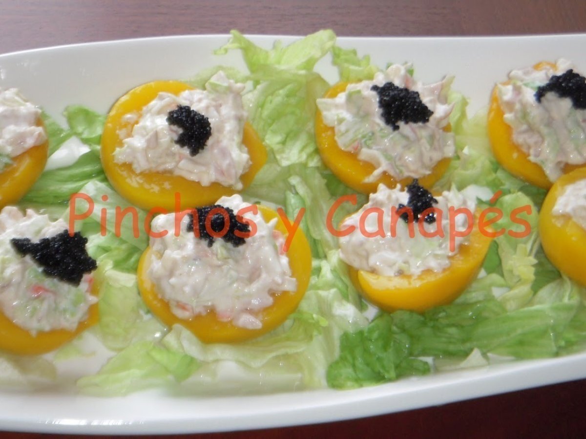 Melocotones en almíbar rellenos EntranteFácil10 min Enviar esta receta a un amigo Imprimir esta página Preguntar al autor Publicar la foto de esta receta Ingredientes 2 1 Bote de melocotones en almíbar Unas hojas de lechuga 1 lata de atún en aceite 3 Palitos de cangrejo 2 cucharadas de Mahonesa Huevas de lumpo