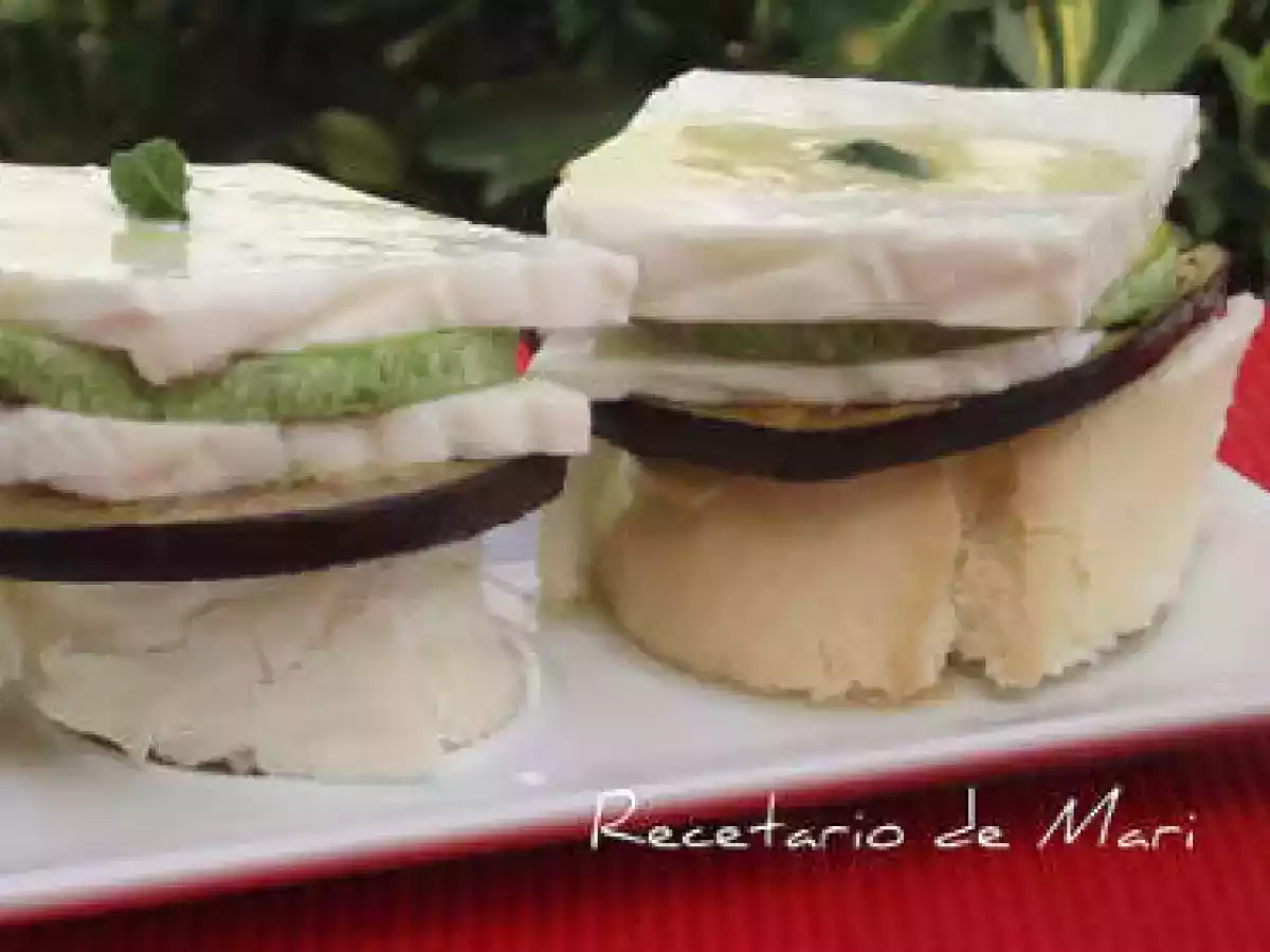 Cogemos el pan, le ponemos una rueda de berenjena, una loncha de queso, una rueda de calabacín y terminamos con otra loncha de queso. Por último dejamos caer un chorrito de miel y listo para degustar.