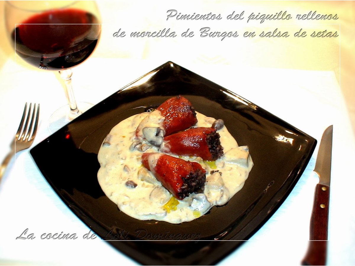 Pimientos del piquillo rellenos de morcilla de burgos en salsa de setas
