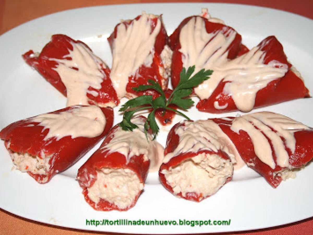 Pimientos del piquillo rellenos de pescado, atún y cangrejo EntranteMedio50 min236 Kcal Enviar esta receta a un amigo Imprimir esta página Preguntar al autor Publicar la foto de esta receta Ingredientes 3 400 grs. de pescado blanco sin piel ni espinas 3 palitos de cangrejo 1 huevo duro 1 lata de atún en aceite Salsa rosa Pimientos del piquillo