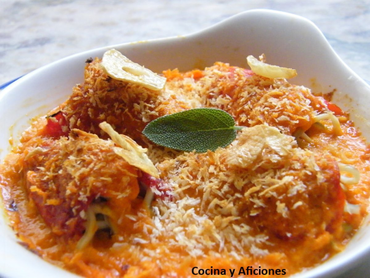 Pimientos rellenos de bacalao y gulas con su salsa