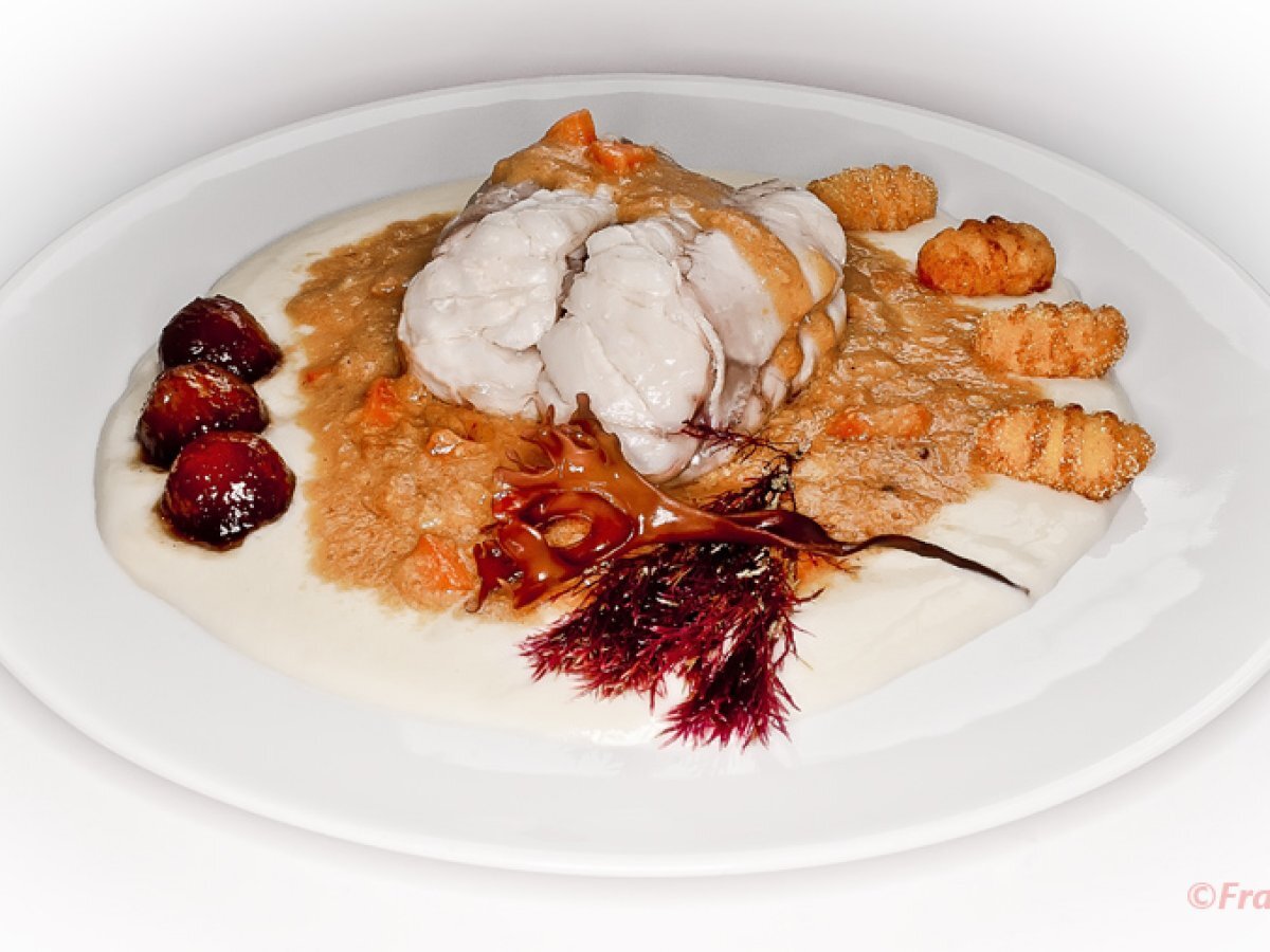 Pixín con salsa oricios y ñoquis de gamoneu EntranteFácil55 min Enviar esta receta a un amigo Imprimir esta página Preguntar al autor Publicar la foto de esta receta Ingredientes 2 1 pixin de un kilo y cuarto 1 cebolla mediana 2 dientes de ajo 200 ml de sidra 2 latas de huevas de erizos 1 cucharada de harina 250 ml de caldo de pescado 1 zanahoria grande 200 g de patata 100 ml de nata 100 ml de agua de cocción de la patata 1 carga para sifón 100 g de harina de maíz precocida 60 g de queso gamoneu 30 ml de leche 1 manzana Vinagre de módena Azúcar Unas algas para emplatar