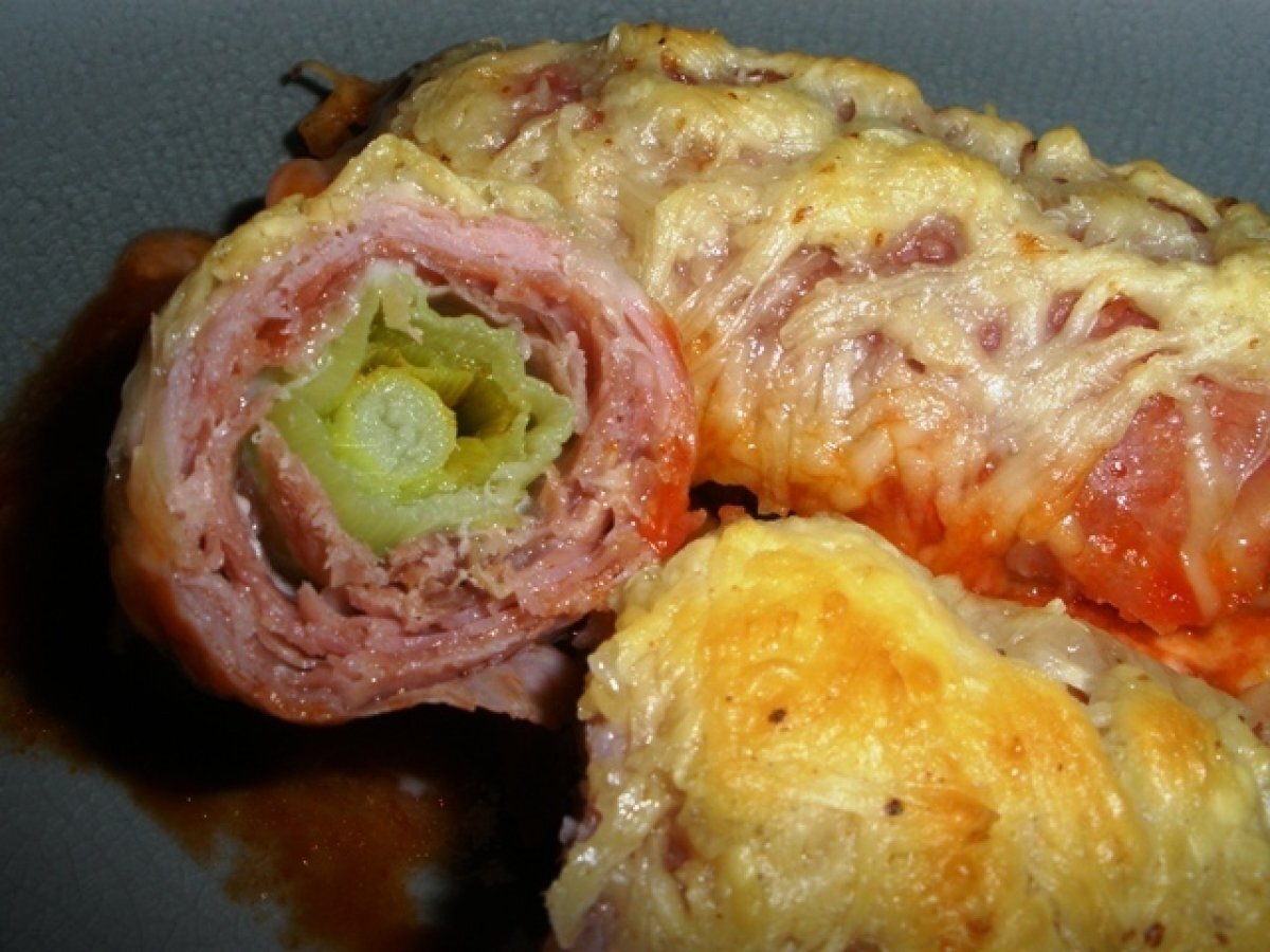 Puerros envueltos en jamón y queso, sobre una cama de tomate, recubiertos con queso para fundir. Una idea muy rica y original de comer verdura.
