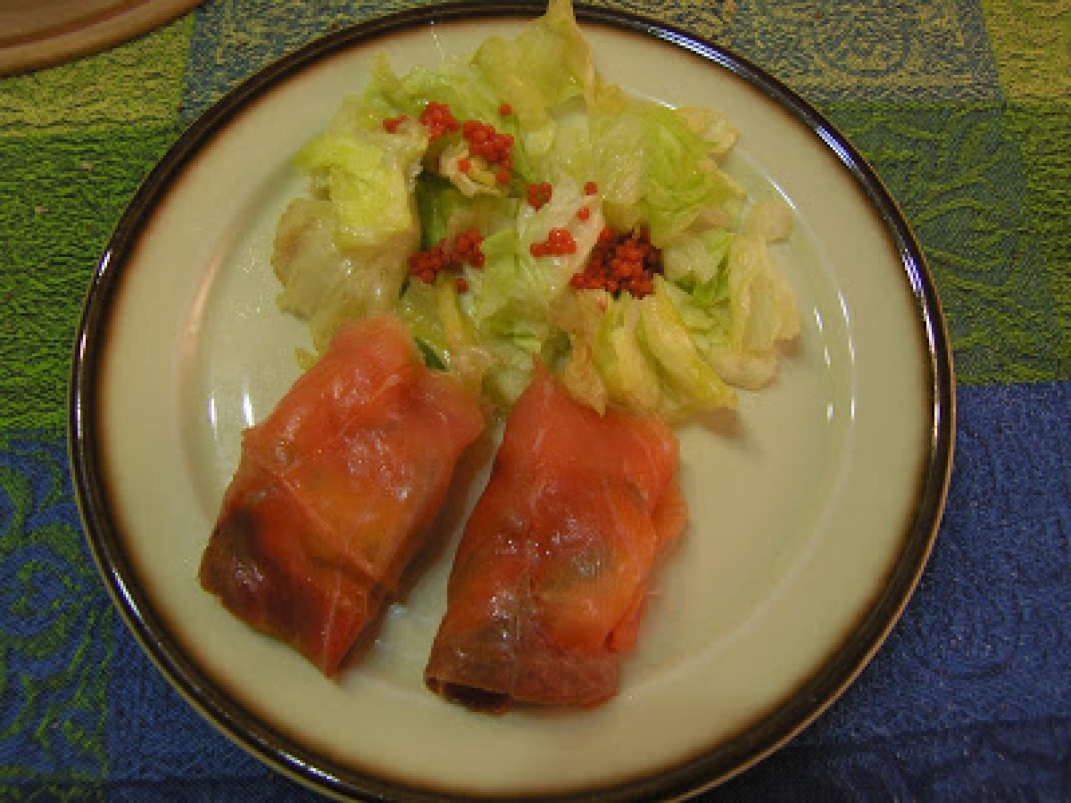 Rollitos de salmon con ensaladilla vota ahora EntranteFácil35 min Enviar esta receta a un amigo Imprimir esta página Preguntar al autor Publicar la foto de esta receta Ingredientes 2 14 Láminas de salmón ahumado 1 Paquete de 1 Kg ensaladilla rusa congelada Lechuga Huevas de salmón Aceite y sal