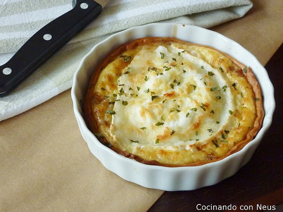 Tarta de cebolla caramelizada con queso de cabra EntranteFácil50 min609 Kcal Enviar esta receta a un amigo Imprimir esta página Preguntar al autor Publicar la foto de esta receta Ingredientes 4 300 gr de masa quebrada 1 cucharada de aceite de oliva virgen 15 gr de mantequilla sin sal 4 cebollas medianas 1 cucharada azúcar 2 ramitas de tomillo, reservar un poco para espolvorear 1 huevo 100 ml de nata líquida 4 rodajas de queso de rulo grande Costo estimado: 3.9Euros€ (0.98€/porción)