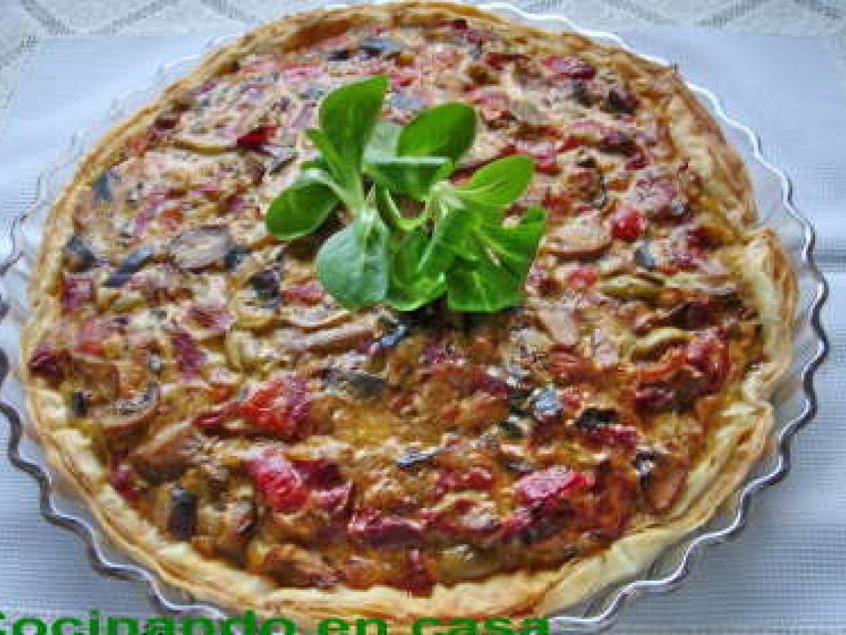 Tarta de verduras con queso y aceitunas EntranteMedio1 h 5 m358 Kcal Enviar esta receta a un amigo Imprimir esta página Preguntar al autor Publicar la foto de esta receta Ingredientes 6 1 Masa de Hojaldre La Cocinera 100 gr. de aceitunas sin hueso 1 puerro 1 pimiento rojo 1 lata de champiñones laminados Pimientos rojos de lata 1 berenjena 4 lonchas de queso 3 huevos orégano Aceite de oliva virgen extra Sal Costo estimado: 5.78Euros€ (0.96€/porción)