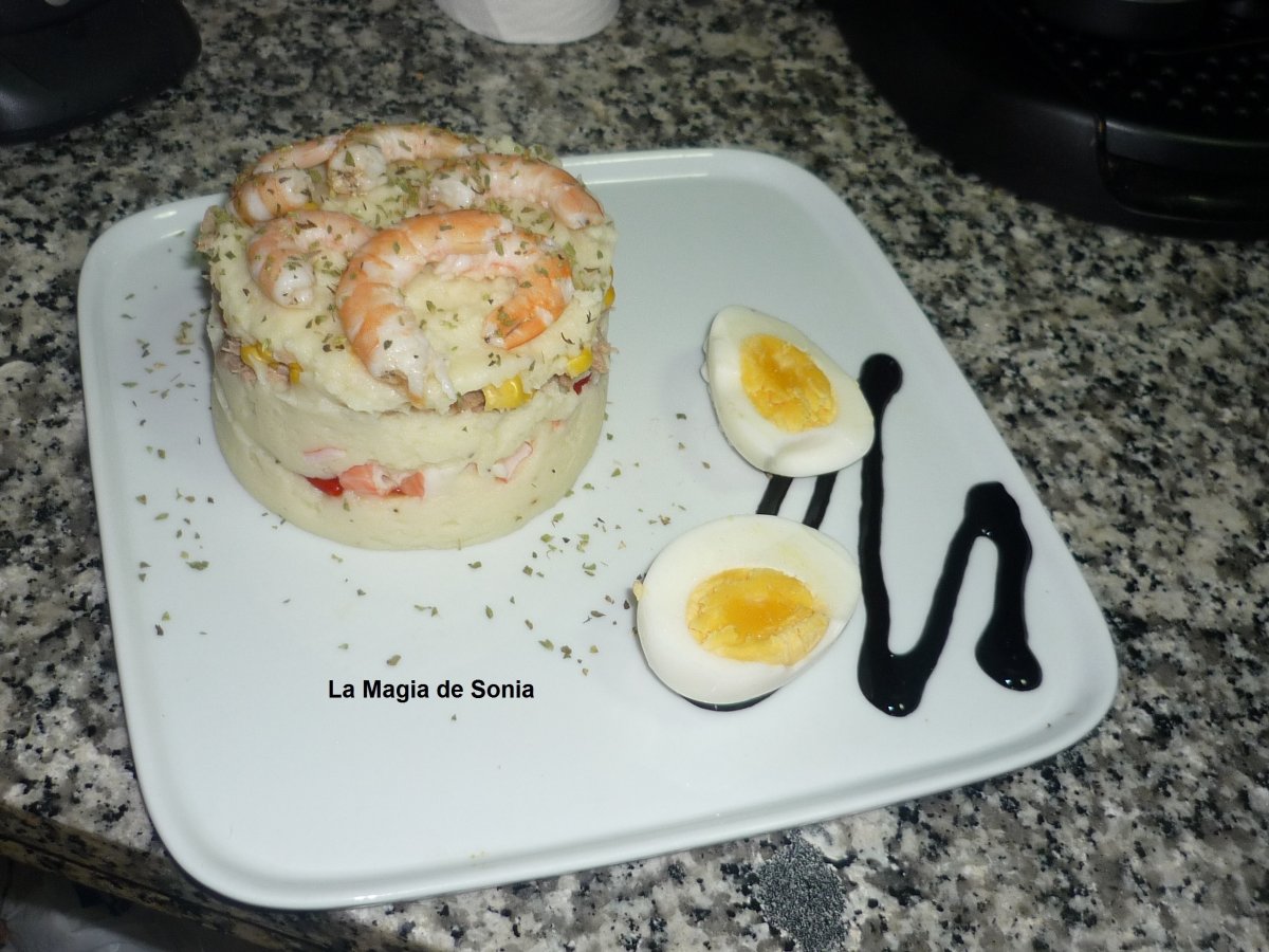 Timbal de patata con langostinos. EntranteFácil30 min215 Kcal Enviar esta receta a un amigo Imprimir esta página Preguntar al autor Publicar la foto de esta receta Ingredientes 6 Para el puré de Patatas: 5 Patatas. Nuez de Mantequilla. Sal y golpe de Pimienta negra. 1 Cucharada sopera de leche. Relleno: 3 Pimientos del piquillo. 1 Latita de atún en escabeche blanco. 2 Cucharadas soperas de maíz. 5 Palitos de Surimi. Decoración: Langostinos. 1 Huevo duro. Orégano Crema de Módena.