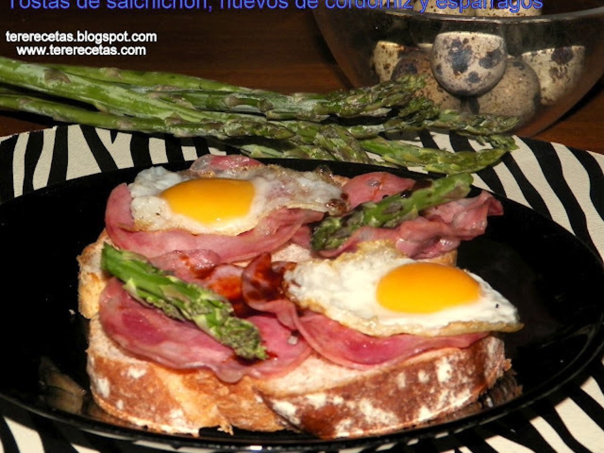 Tostas de salchichón, huevos de codorniz y espárragos.