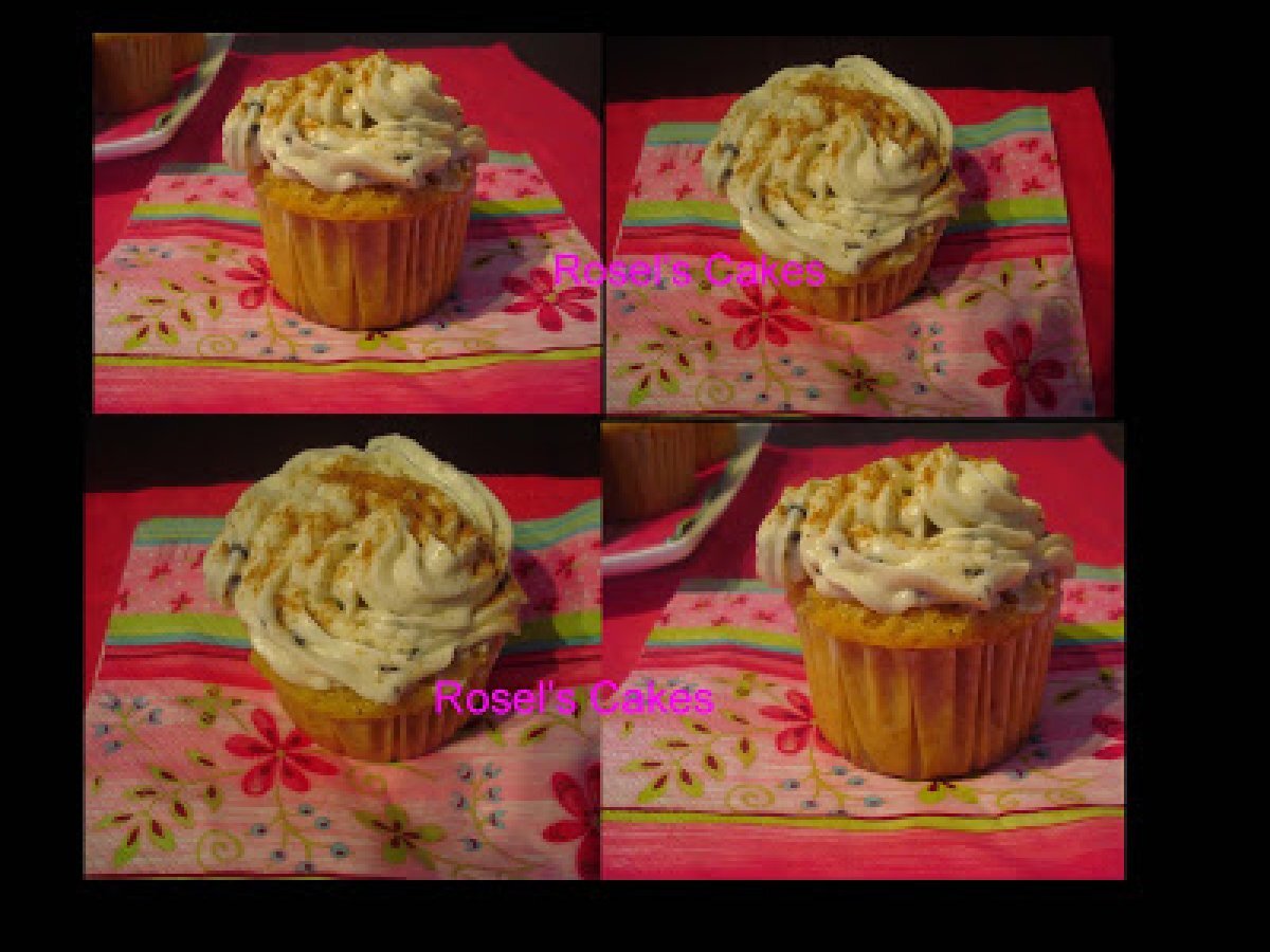 Cupcakes con hershey's cookies 'n' creme MeriendaMedio55 min2127 Kcal Enviar esta receta a un amigo Imprimir esta página Preguntar al autor Publicar la foto de esta receta Ingredientes 4 2 tazas de harina de trigo 1/3 taza de azucar morena 1/3 de taza de azucar blanca 1 puñadito de nueces picadas 1 puñadito de chocolate blanco 1/2 cucharadita de sal 2/3 taza de leche 115 gr de margarina Para el topping: 1 queso crema philadelphia 1/2 taza de margarina 4 tazas de azucar glass 1 cucharada de esencia de vainilla 2 barras de Hershey's Cookies 'n' Creme previamente derretido en el micro. 2 cucharaditas de canela para espolvorear