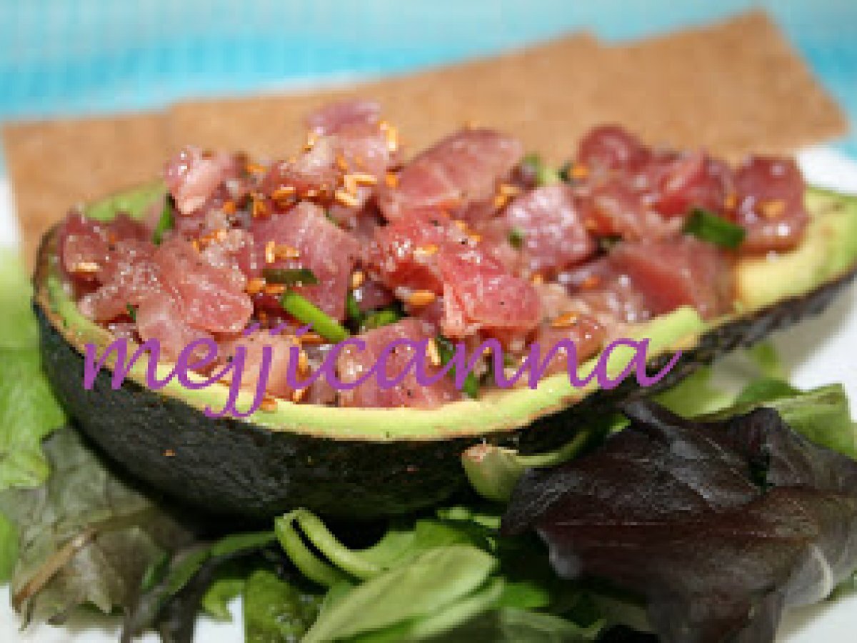Aguacate relleno de atún fresco vota ahora PlatoFácil30 min Enviar esta receta a un amigo Imprimir esta página Preguntar al autor Publicar la foto de esta receta Ingredientes 2 300 g de atún fresco. 3 cucharadas de aceite de oliva . 3 cucharadas de salsa de soja. 3 cucharadas de vinagre de modena. jengibre rallado. cebollino picado. 2 limas . 2 cucharada de semillas de sésamo tostadas wasabi al gusto. 6 aguacates.