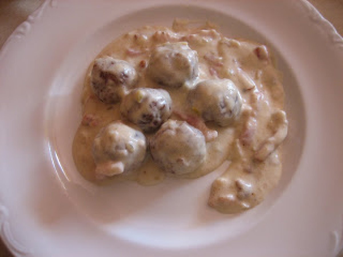Albóndigas a la carbonara PlatoFácil55 min345 Kcal Enviar esta receta a un amigo Imprimir esta página Preguntar al autor Publicar la foto de esta receta Ingredientes 6 1/2 kg de carne picada 1 huevo 1 diente de ajo Perejil Pan rallado Harina 1 cebolla pequeña 200 g de Bacon 1 vaso de sidra 2 brick de nata Sal y pimienta Costo estimado: 8.59Euros€ (1.43€/porción)