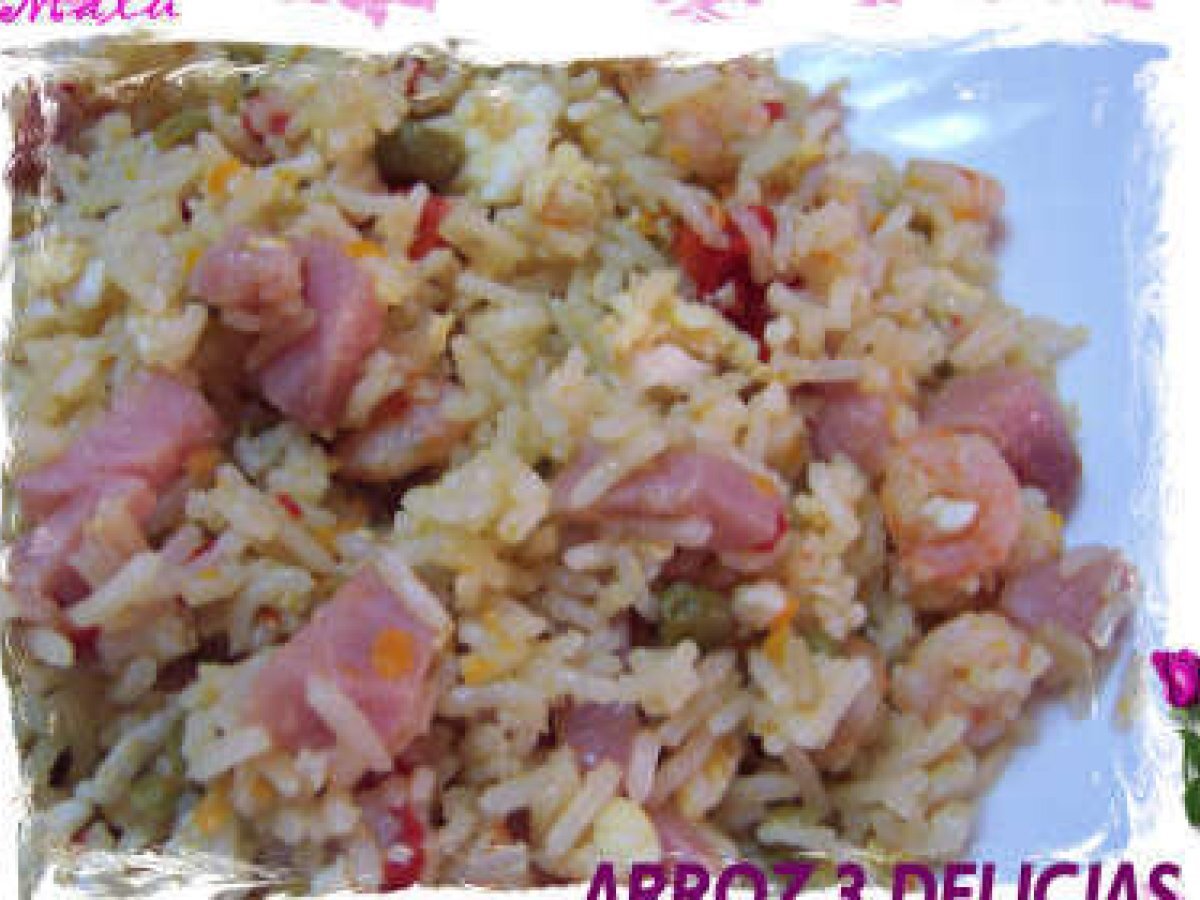 Arroz 3 delicias, a mi manera PlatoMedio45 min Enviar esta receta a un amigo Imprimir esta página Preguntar al autor Publicar la foto de esta receta Ingredientes 1 Vaso y medio de arroz basmati ( aromático ) 2 zanahorias recién ralladas 200 grs. de gambitas congeladas 60 grs. de pimiento morrón ( 1 lata pequeñita ) 120 grs. de guisantes hervidos ( de lata ) 2 huevos 175 grs. de jamón york a taquitos Aceite de oliva Sal 1 cucharada de soja